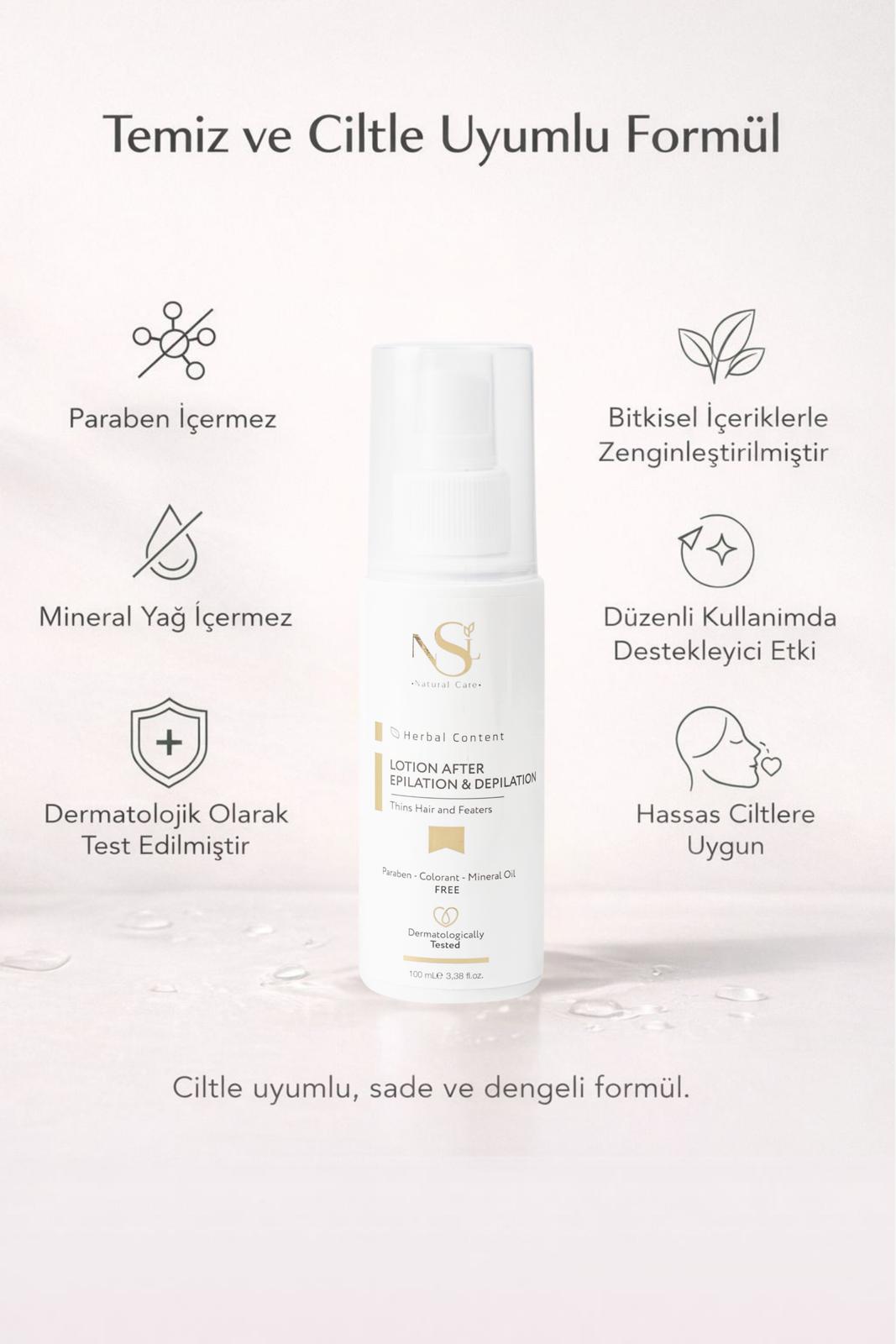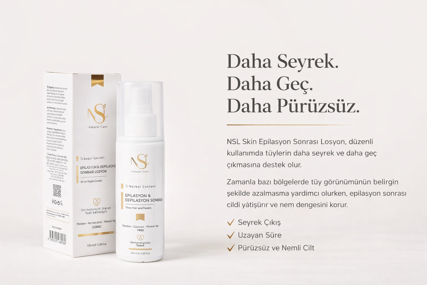 NSL Skin Epilasyon Sonrası Losyon, epilasyon sonrası cilt bakımını desteklemek amacıyla geliştirilmiş, ciltle uyumlu ve durulama gerektirmeyen yapısıyla bakım rutinlerine rahatlıkla dahil edilebilir.